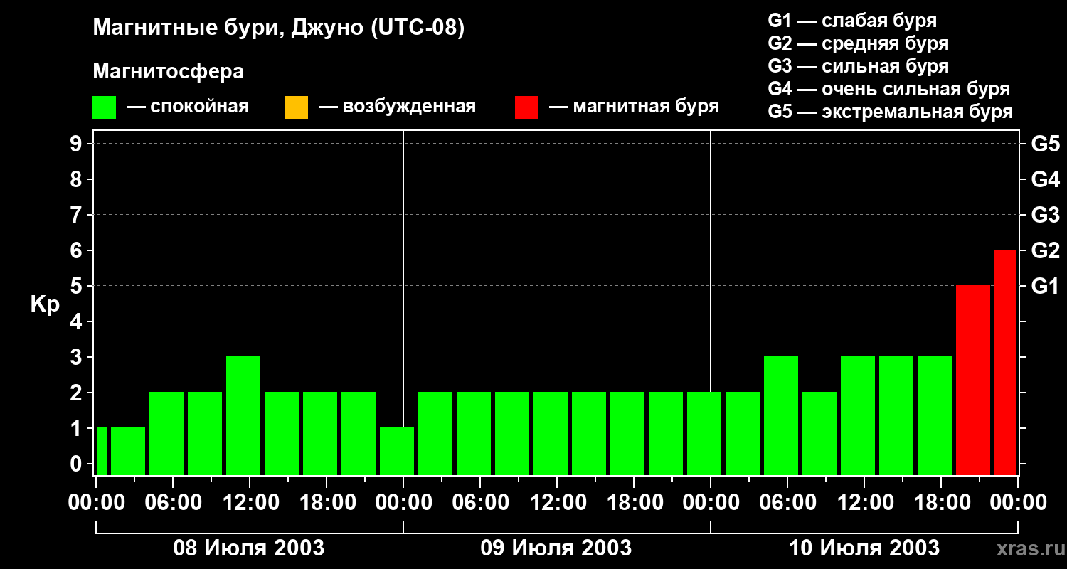 Изменения геомагнитного индекса Kp с 8 по 10 июля 2003 года для средних широт