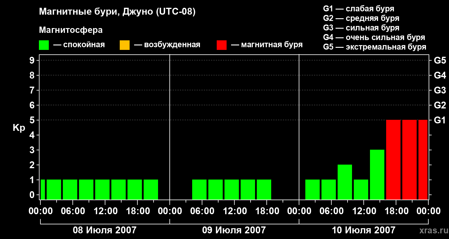 Изменения геомагнитного индекса Kp с 8 по 10 июля 2007 года для средних широт