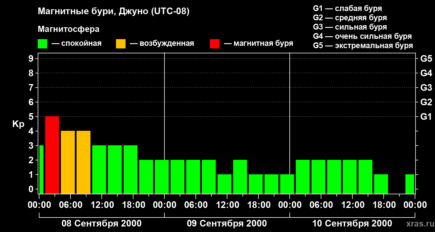 Изменения геомагнитного индекса Kp с 8 по 10 сентября 2000 года для средних широт