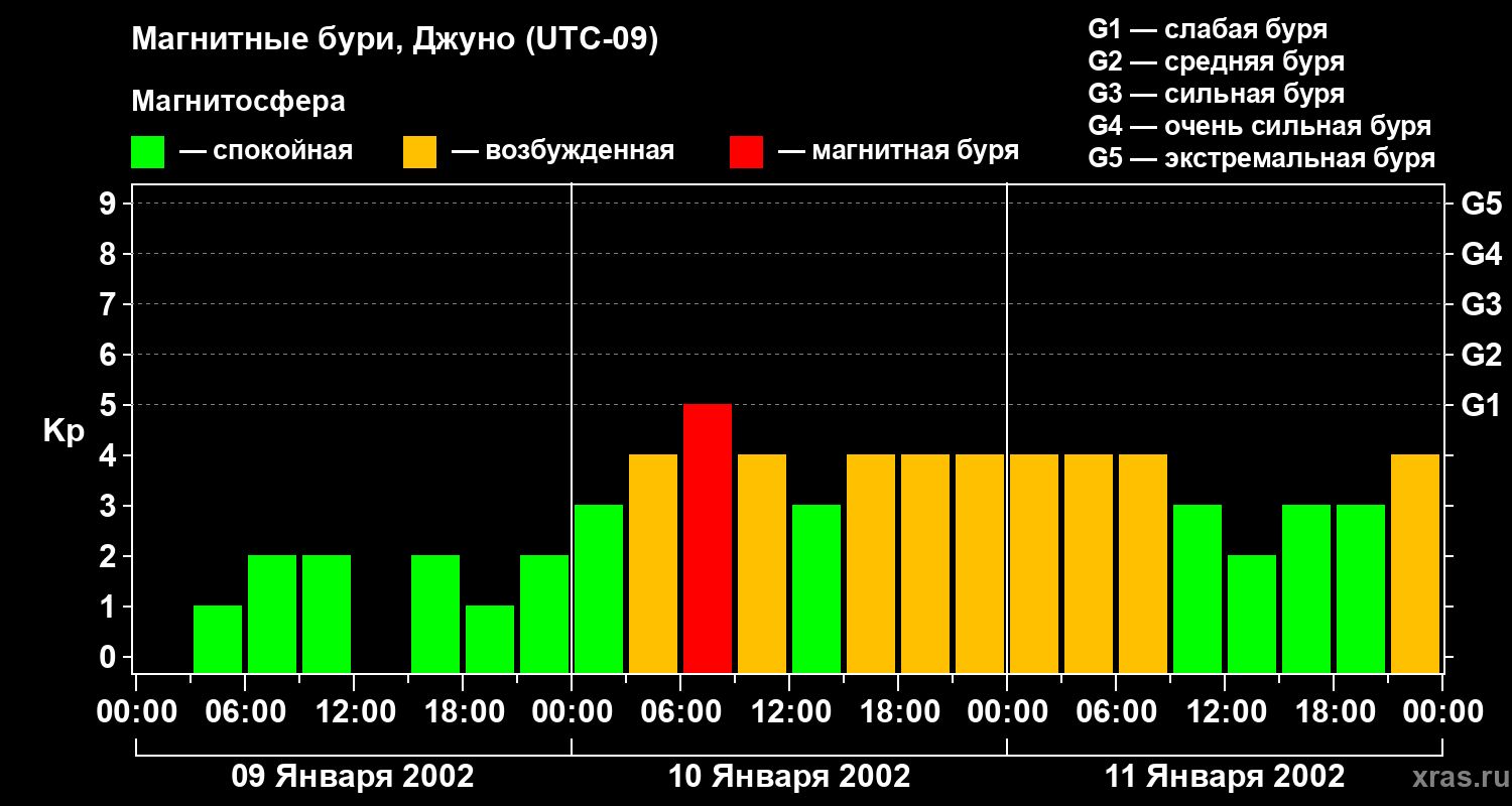 Изменения геомагнитного индекса Kp с 9 по 11 января 2002 года для средних широт