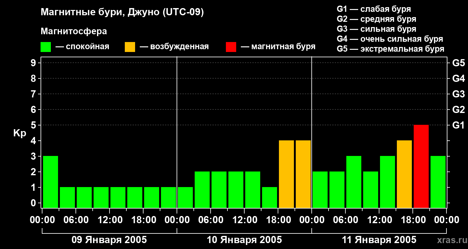Изменения геомагнитного индекса Kp с 9 по 11 января 2005 года для средних широт