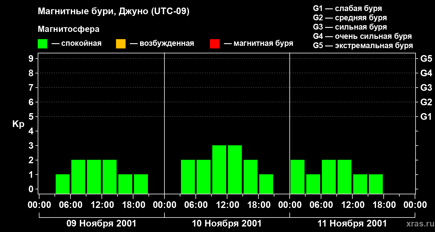 Изменения геомагнитного индекса Kp с 9 по 11 ноября 2001 года для средних широт