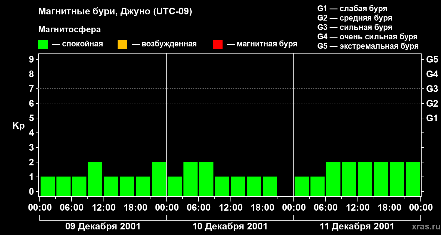 Изменения геомагнитного индекса Kp с 9 по 11 декабря 2001 года для средних широт