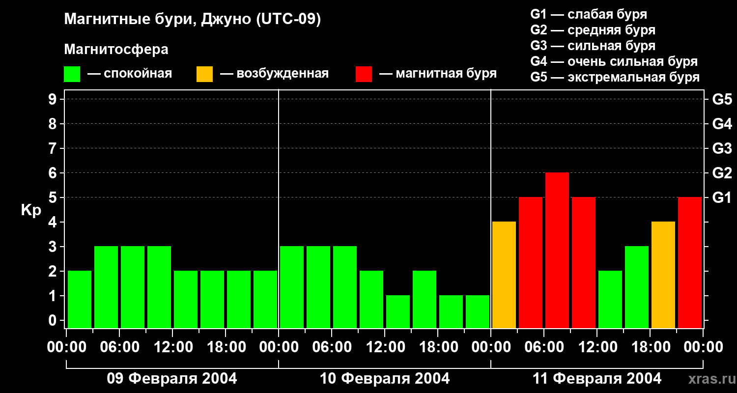 Изменения геомагнитного индекса Kp с 9 по 11 февраля 2004 года для средних широт