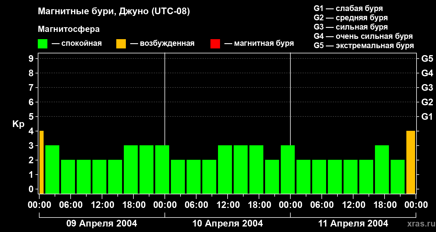 Изменения геомагнитного индекса Kp с 9 по 11 апреля 2004 года для средних широт
