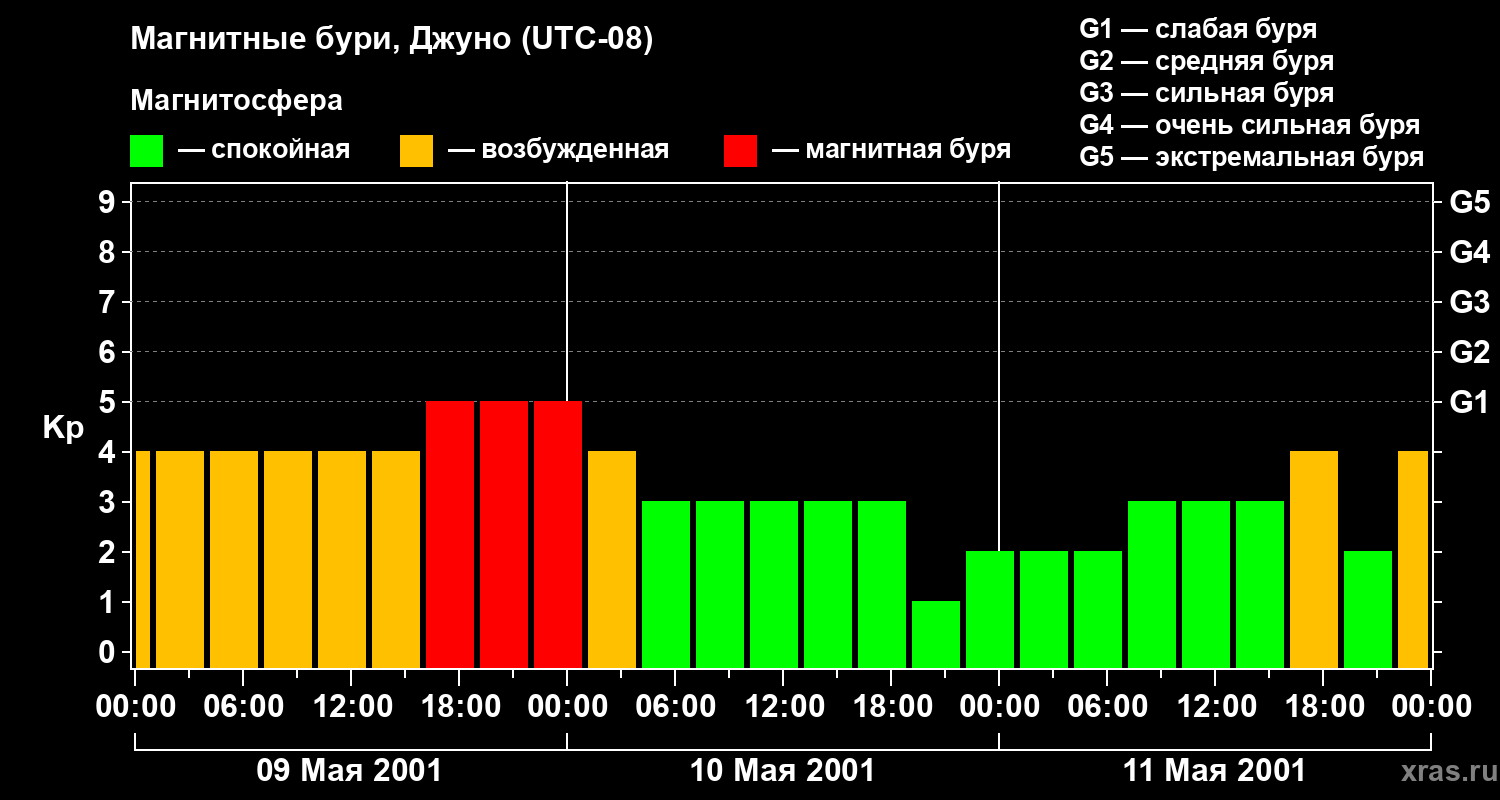 Изменения геомагнитного индекса Kp с 9 по 11 мая 2001 года для средних широт