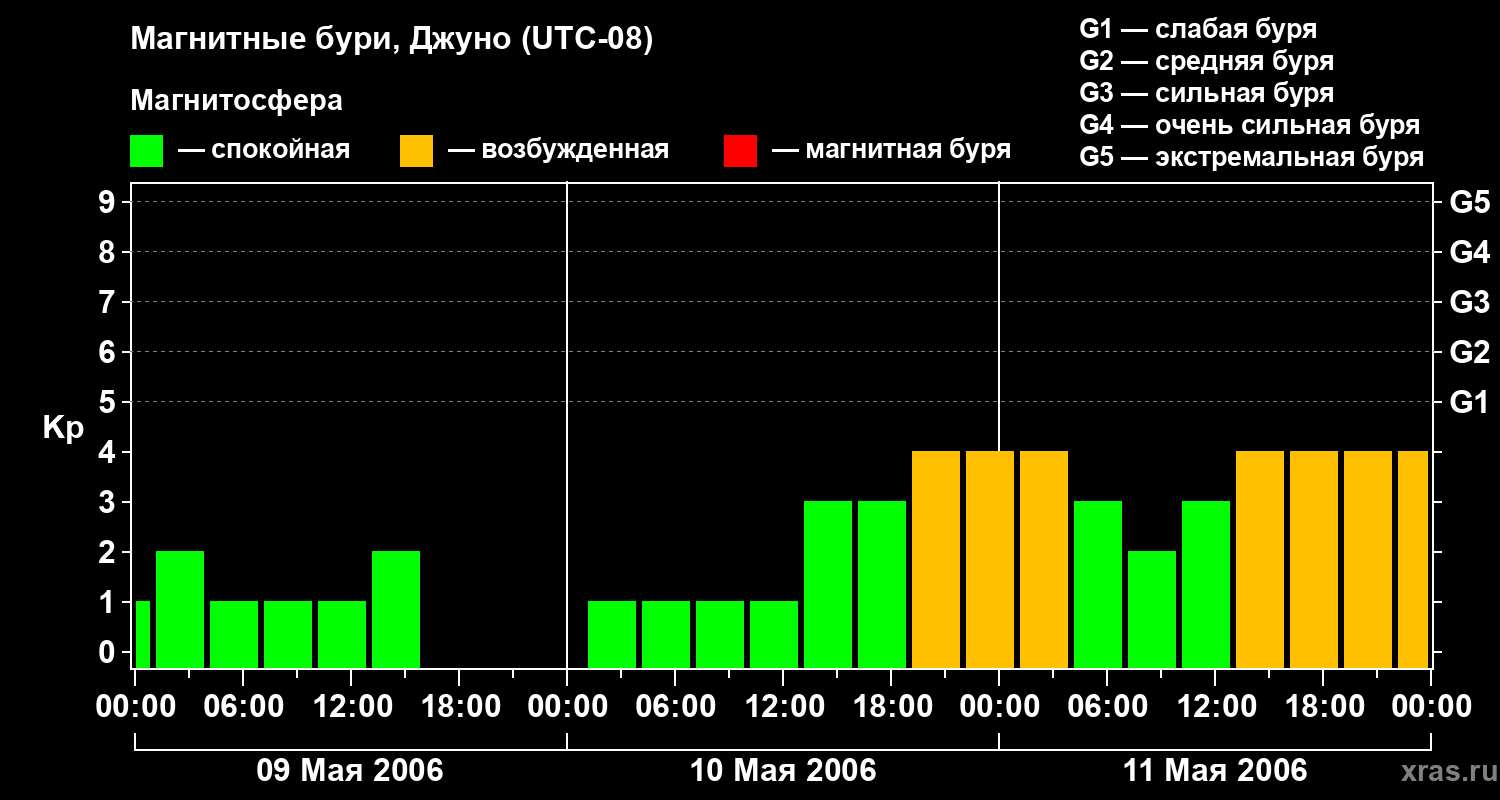 Изменения геомагнитного индекса Kp с 9 по 11 мая 2006 года для средних широт