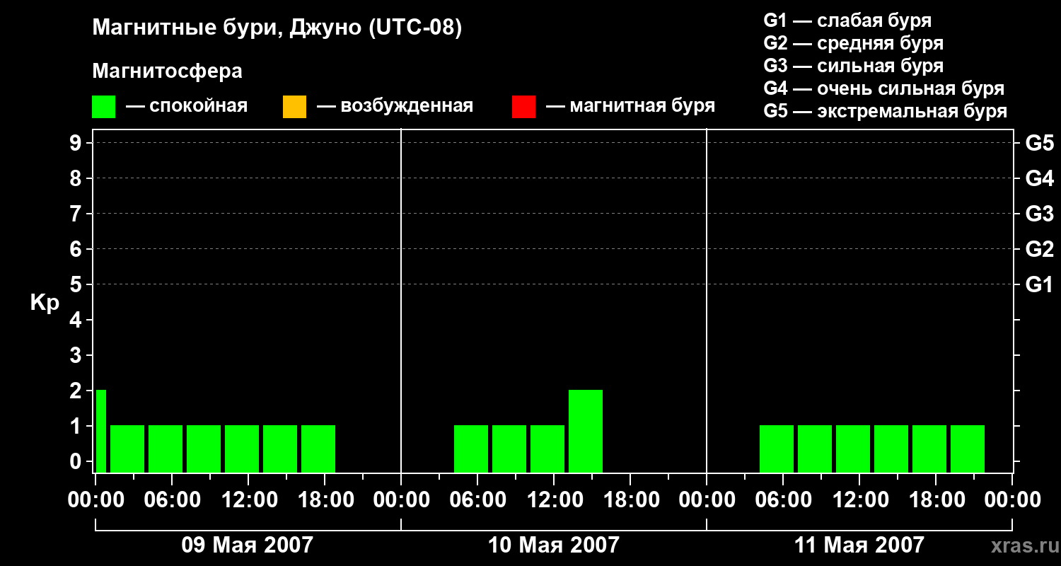 Изменения геомагнитного индекса Kp с 9 по 11 мая 2007 года для средних широт
