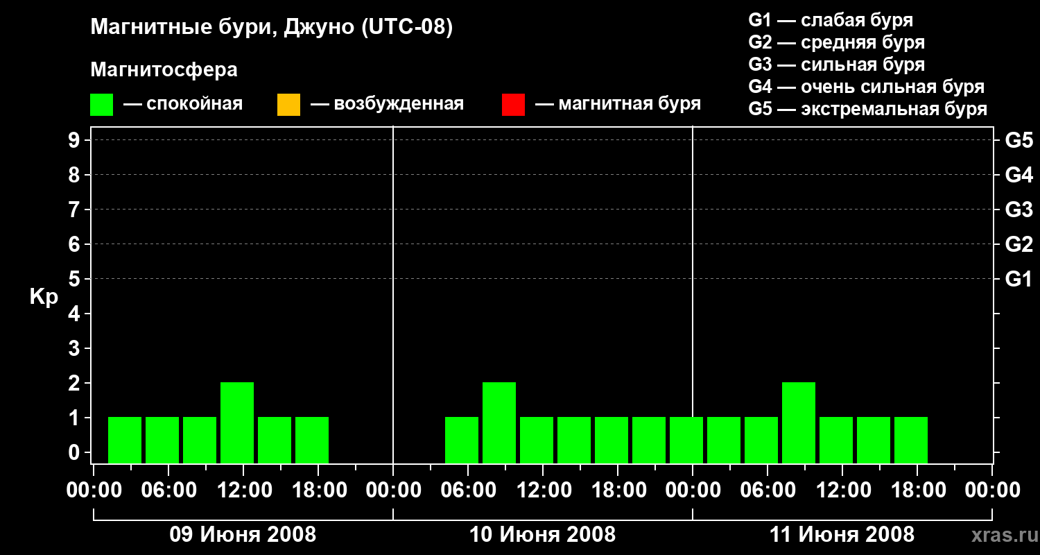Изменения геомагнитного индекса Kp с 9 по 11 июня 2008 года для средних широт