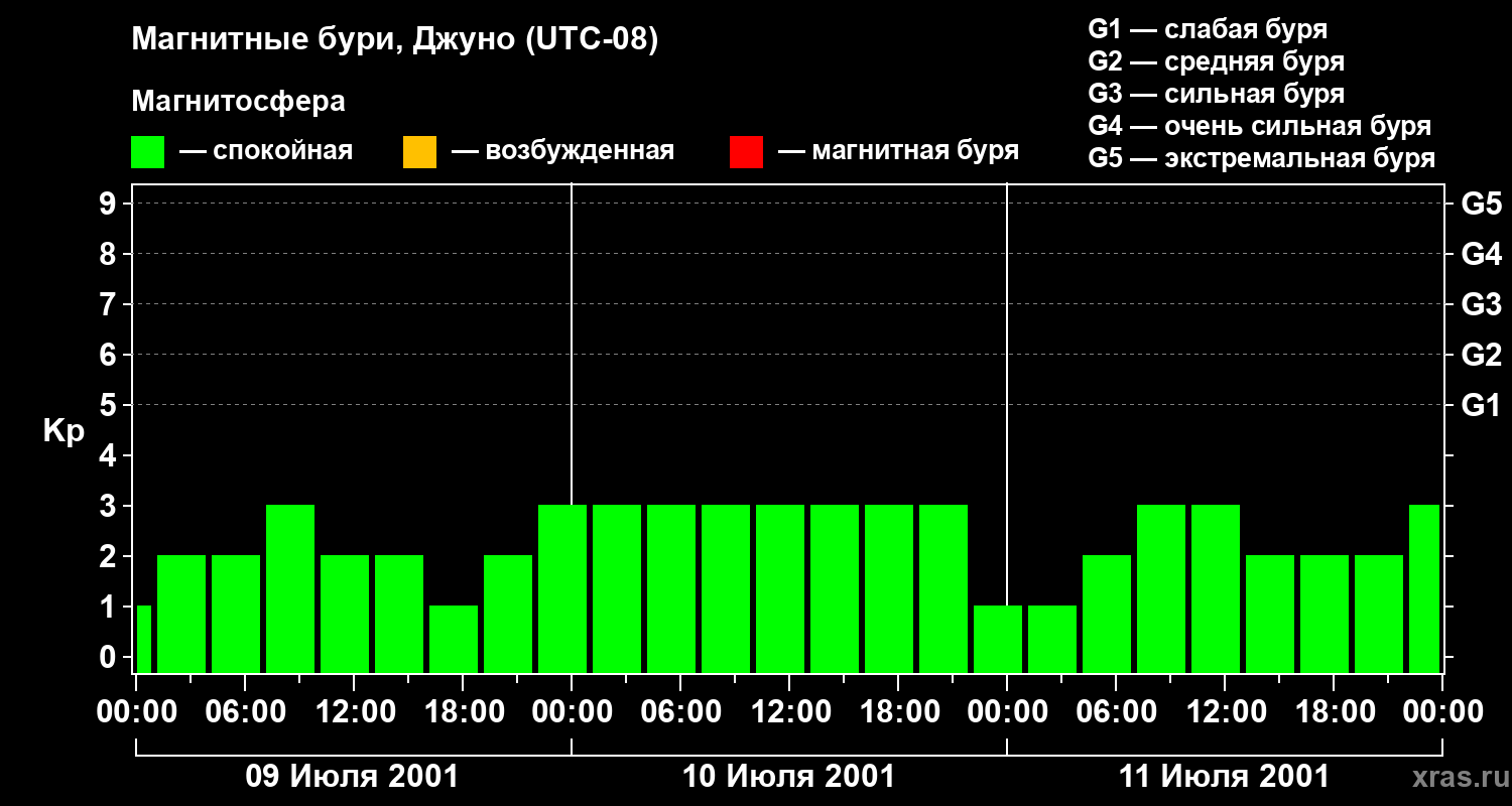 Изменения геомагнитного индекса Kp с 9 по 11 июля 2001 года для средних широт
