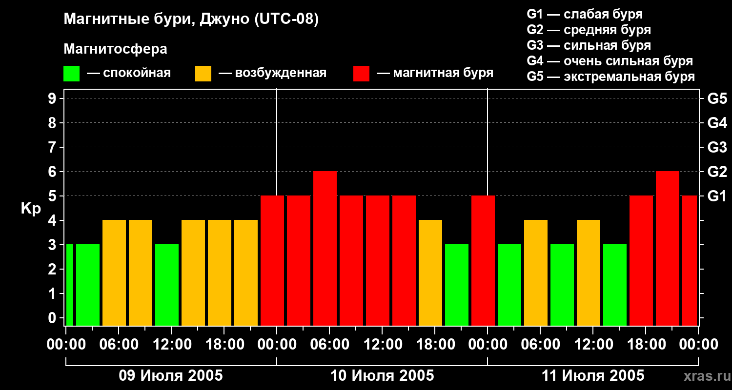 Изменения геомагнитного индекса Kp с 9 по 11 июля 2005 года для средних широт