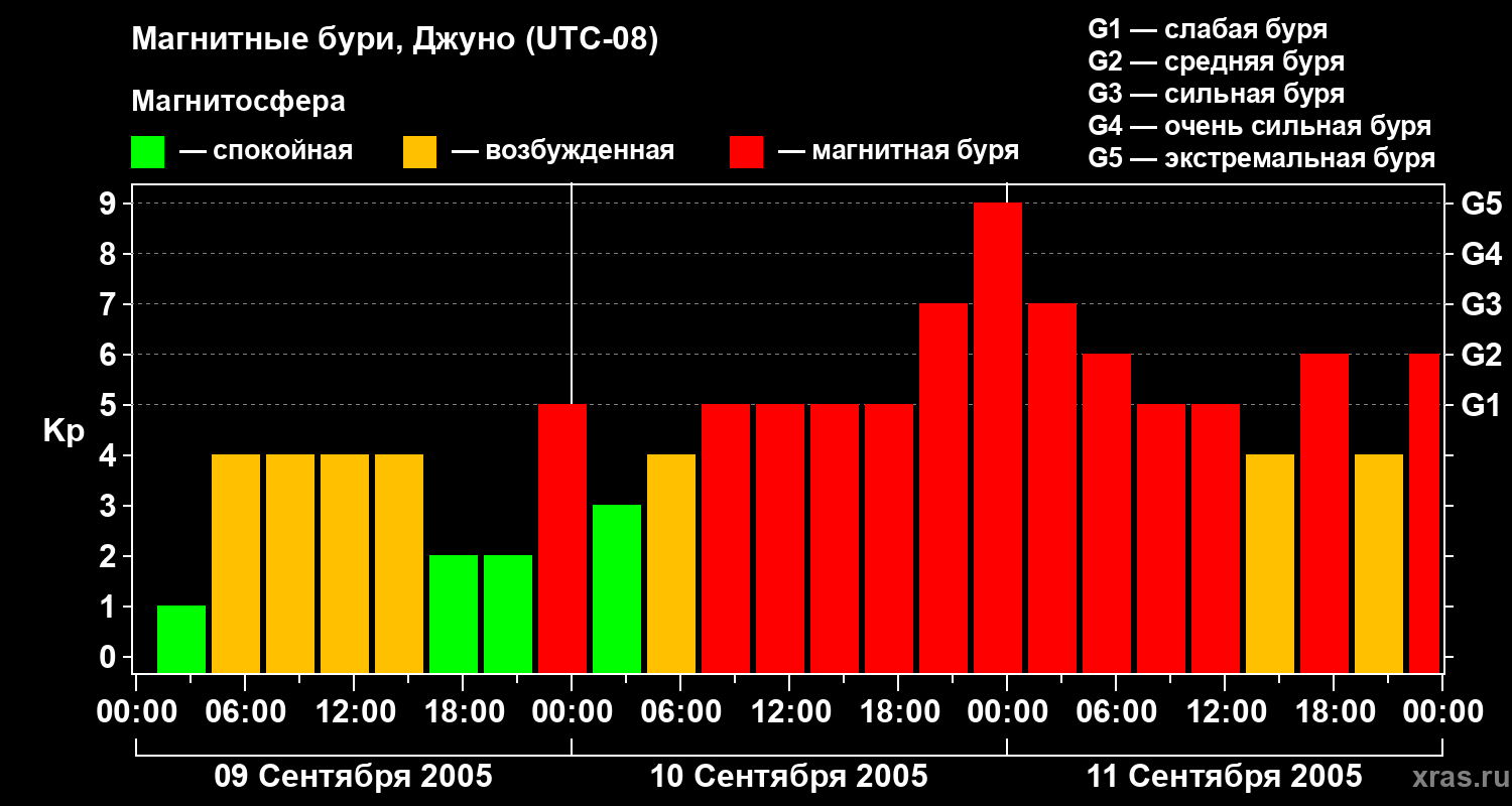 Изменения геомагнитного индекса Kp с 9 по 11 сентября 2005 года для средних широт