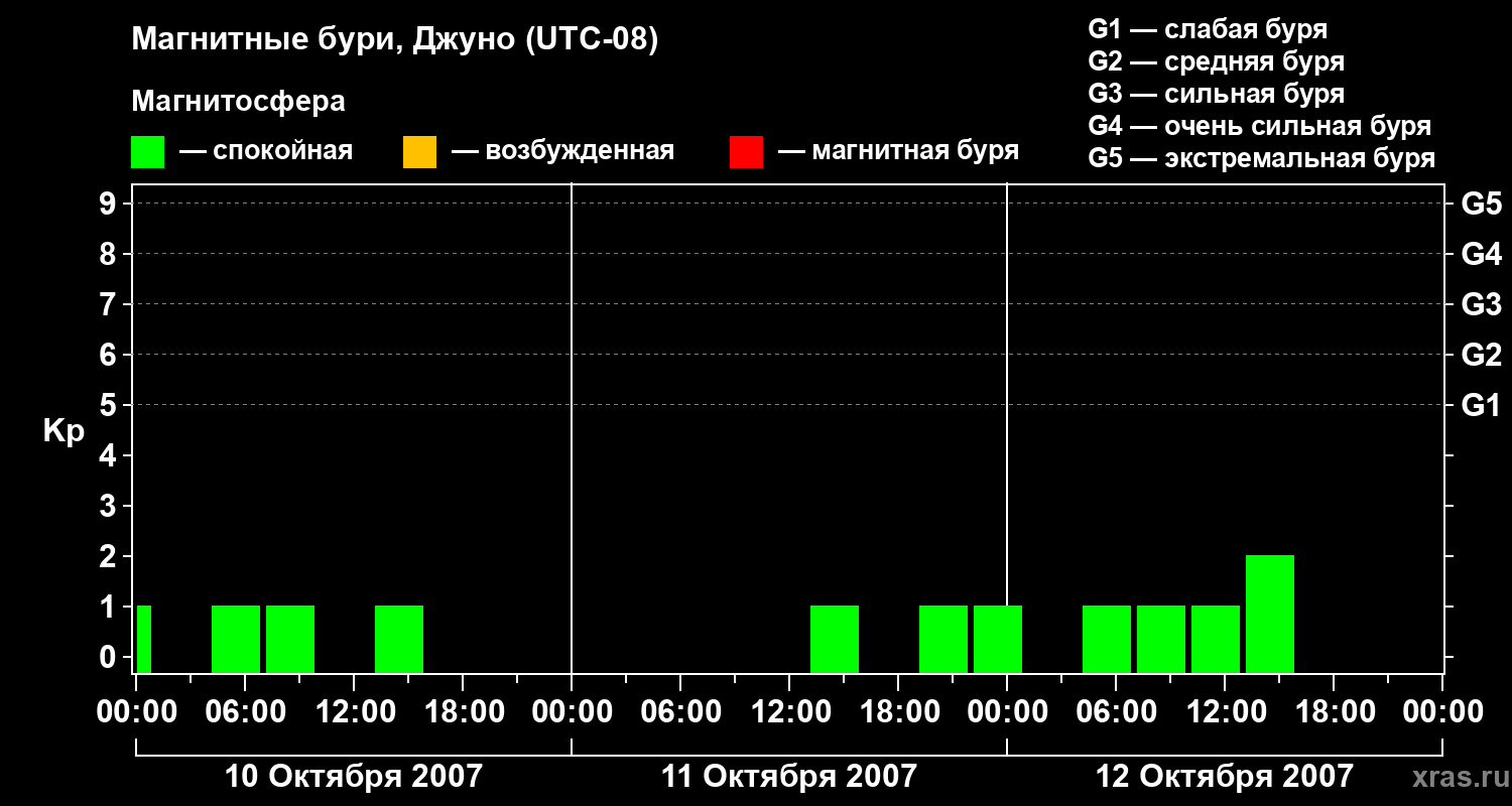 Изменения геомагнитного индекса Kp с 10 по 12 октября 2007 года для средних широт