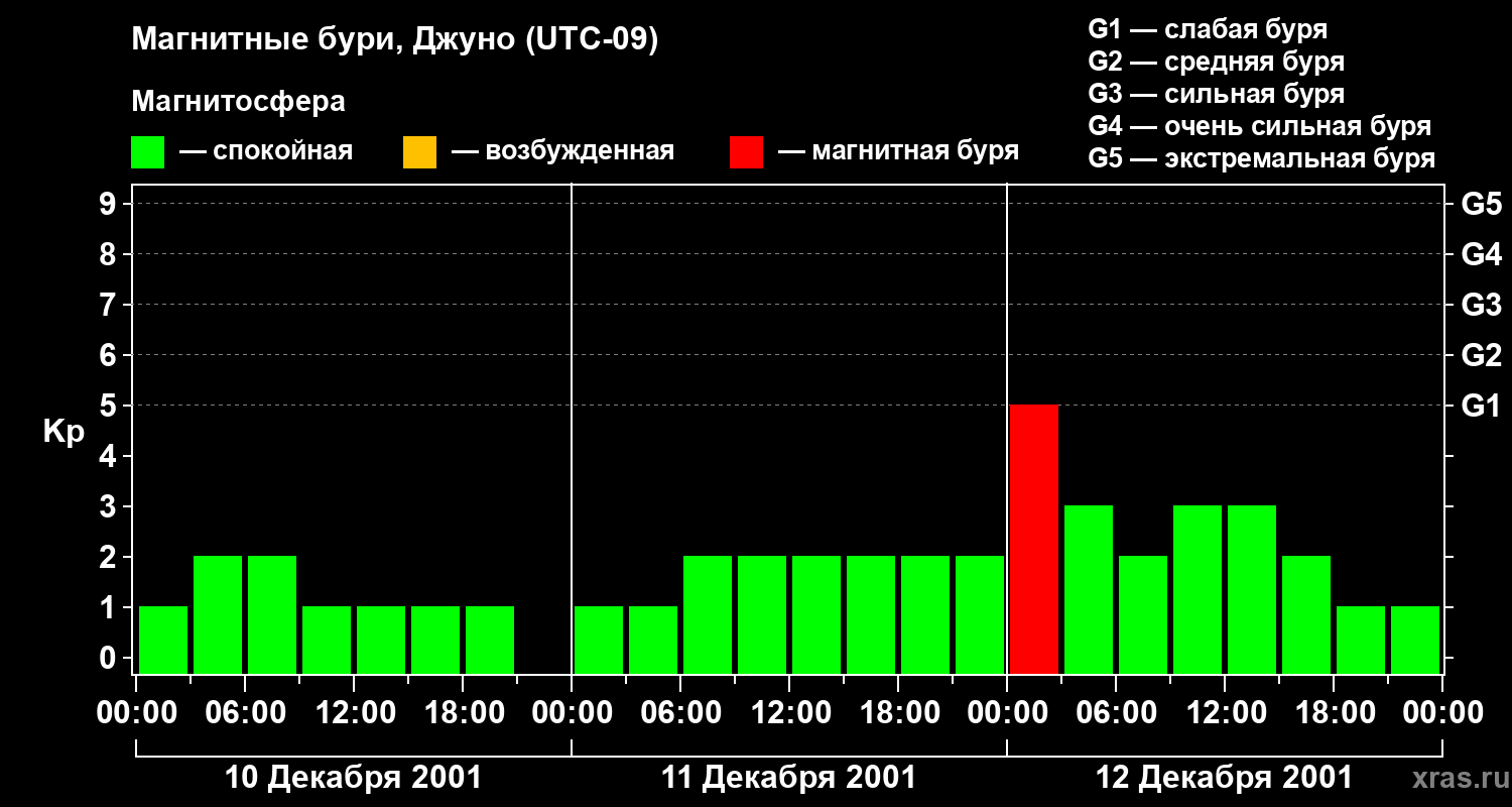 Изменения геомагнитного индекса Kp с 10 по 12 декабря 2001 года для средних широт