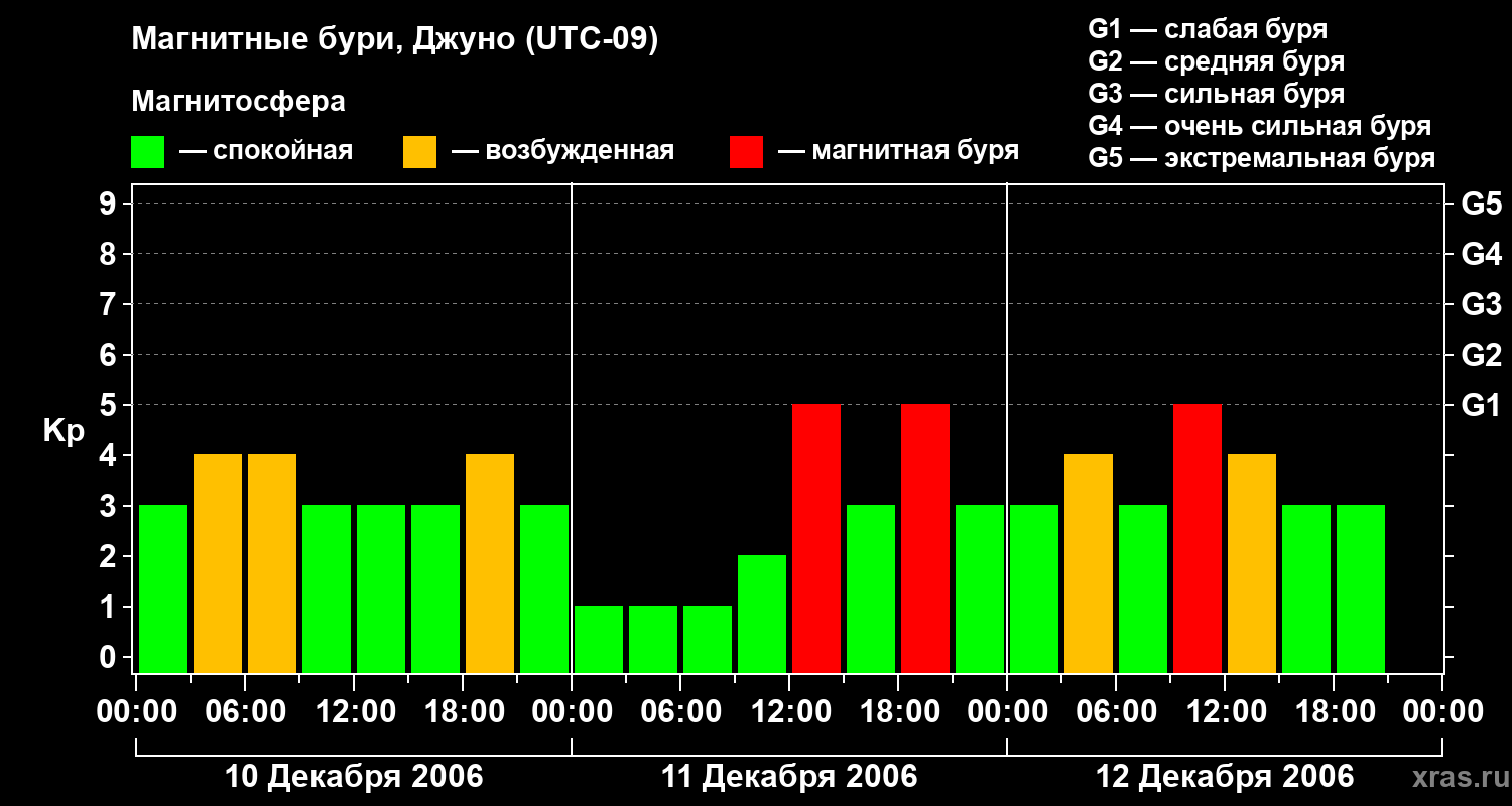 Изменения геомагнитного индекса Kp с 10 по 12 декабря 2006 года для средних широт