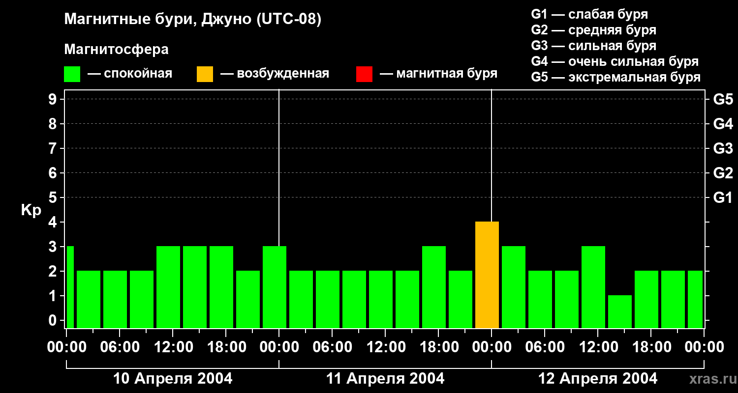 Изменения геомагнитного индекса Kp с 10 по 12 апреля 2004 года для средних широт