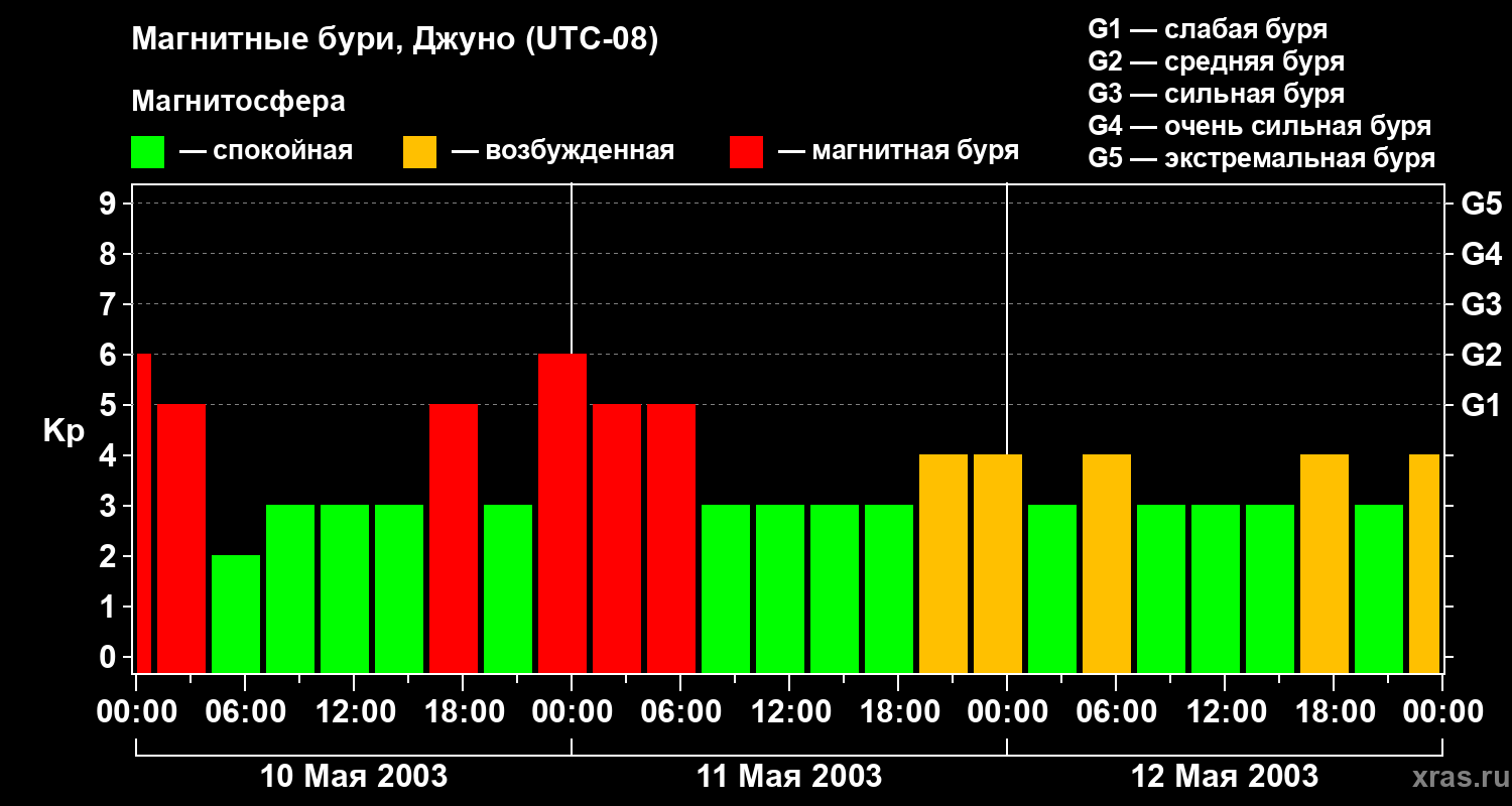 Изменения геомагнитного индекса Kp с 10 по 12 мая 2003 года для средних широт