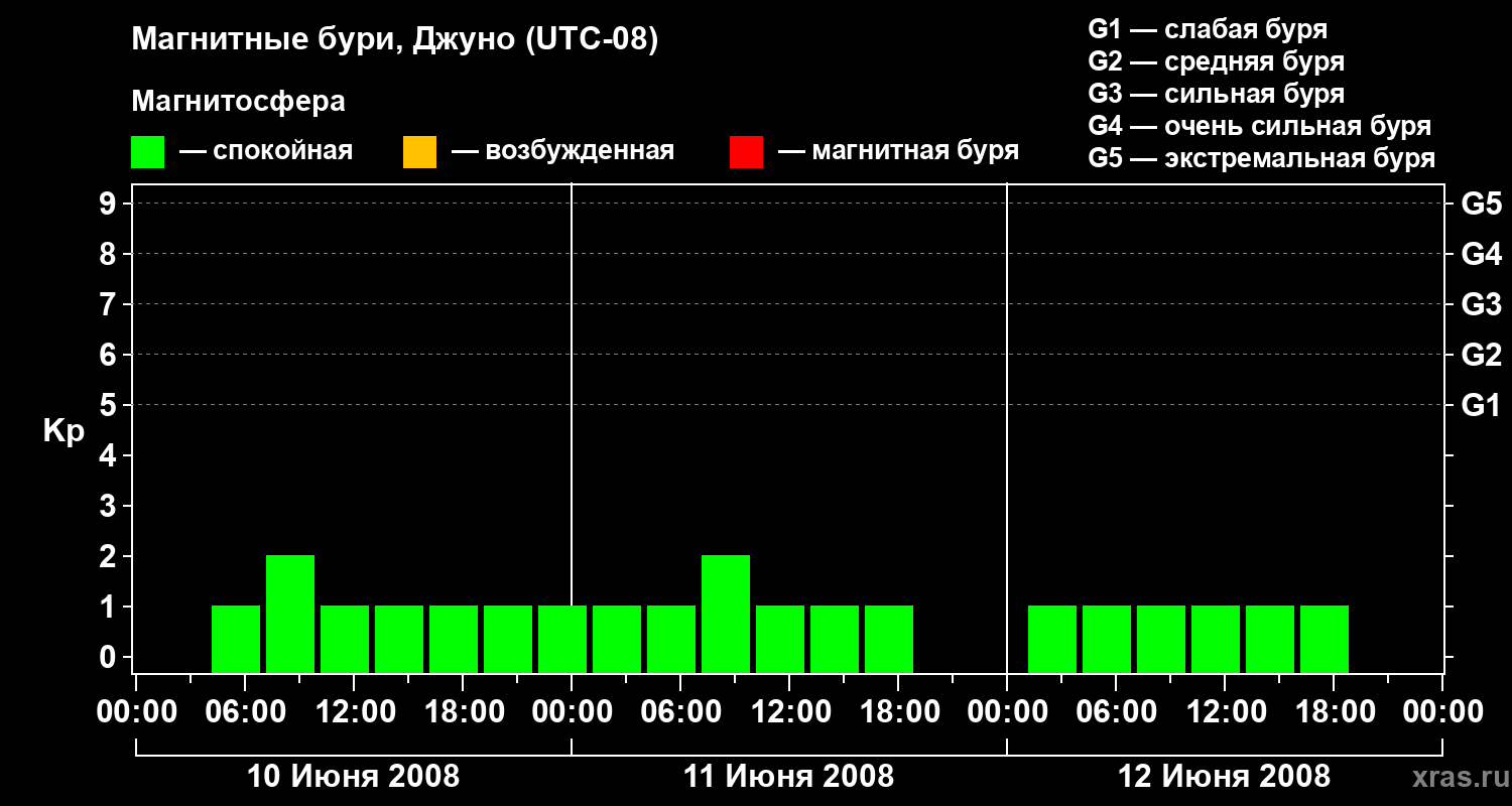 Изменения геомагнитного индекса Kp с 10 по 12 июня 2008 года для средних широт