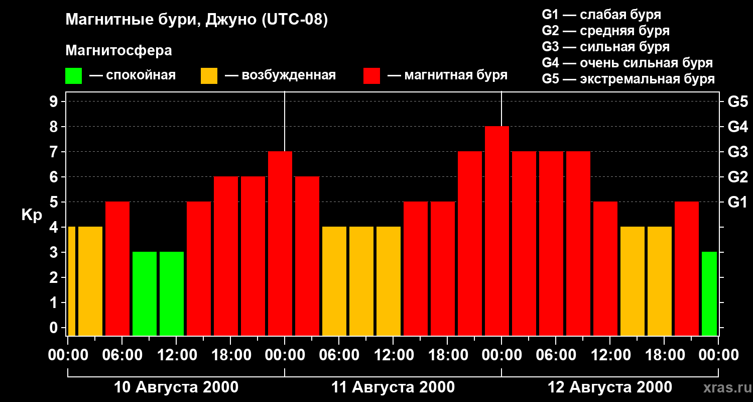 Изменения геомагнитного индекса Kp с 10 по 12 августа 2000 года для средних широт