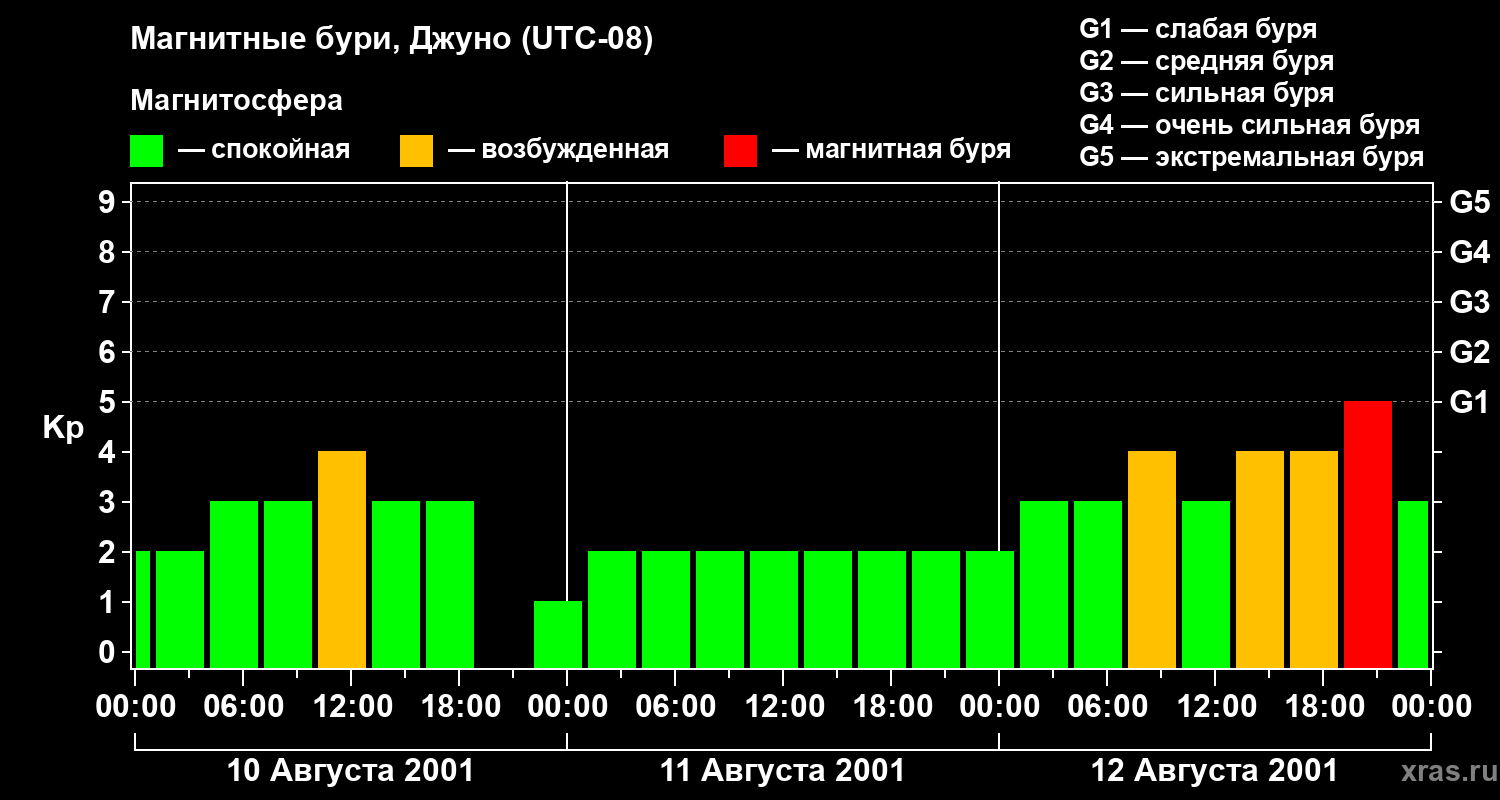 Изменения геомагнитного индекса Kp с 10 по 12 августа 2001 года для средних широт
