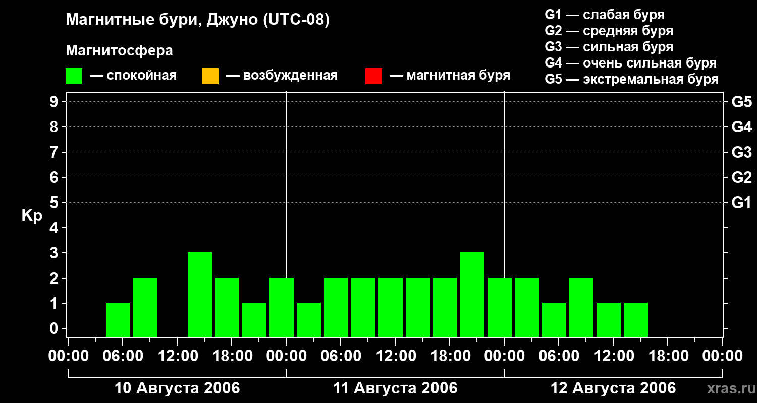 Изменения геомагнитного индекса Kp с 10 по 12 августа 2006 года для средних широт