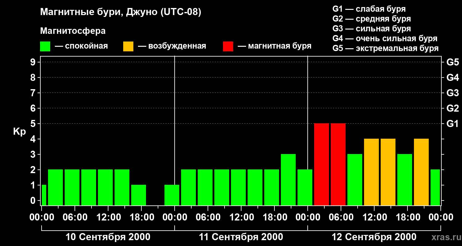 Изменения геомагнитного индекса Kp с 10 по 12 сентября 2000 года для средних широт