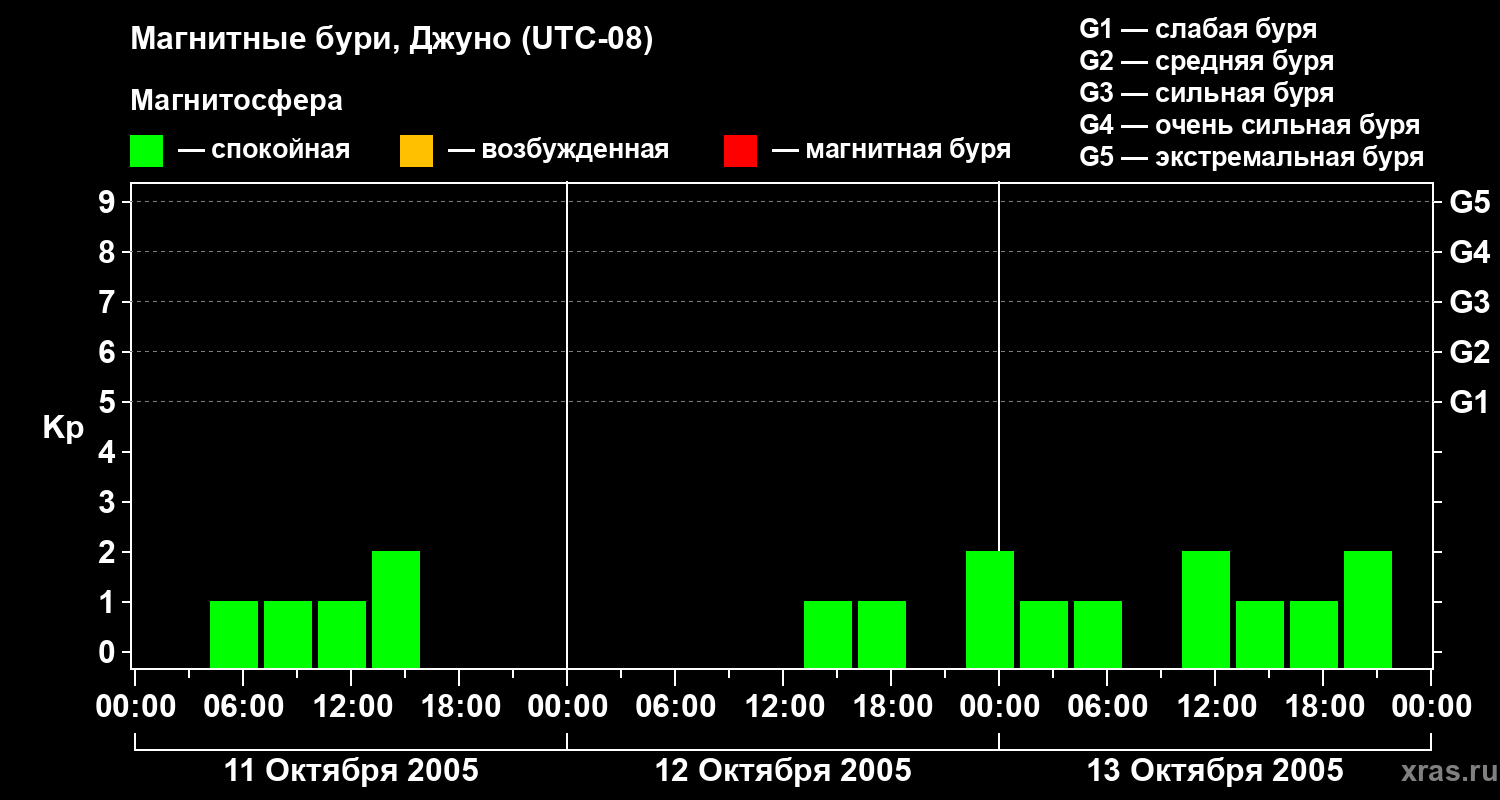 Изменения геомагнитного индекса Kp с 11 по 13 октября 2005 года для средних широт