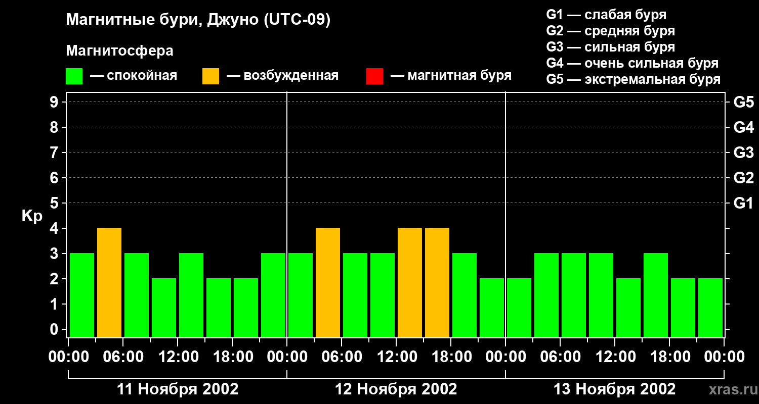 Изменения геомагнитного индекса Kp с 11 по 13 ноября 2002 года для средних широт