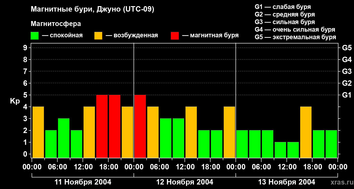 Изменения геомагнитного индекса Kp с 11 по 13 ноября 2004 года для средних широт