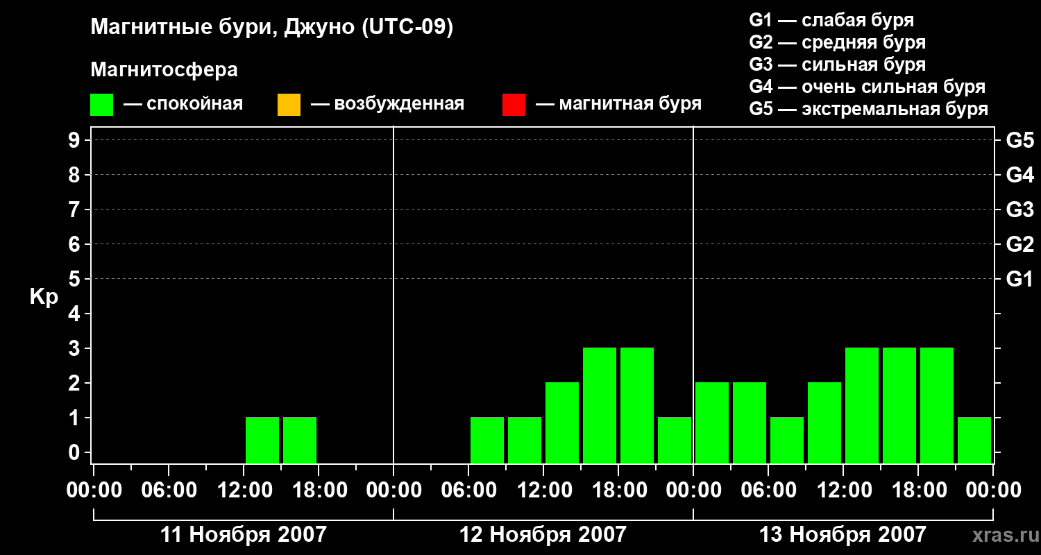 Изменения геомагнитного индекса Kp с 11 по 13 ноября 2007 года для средних широт