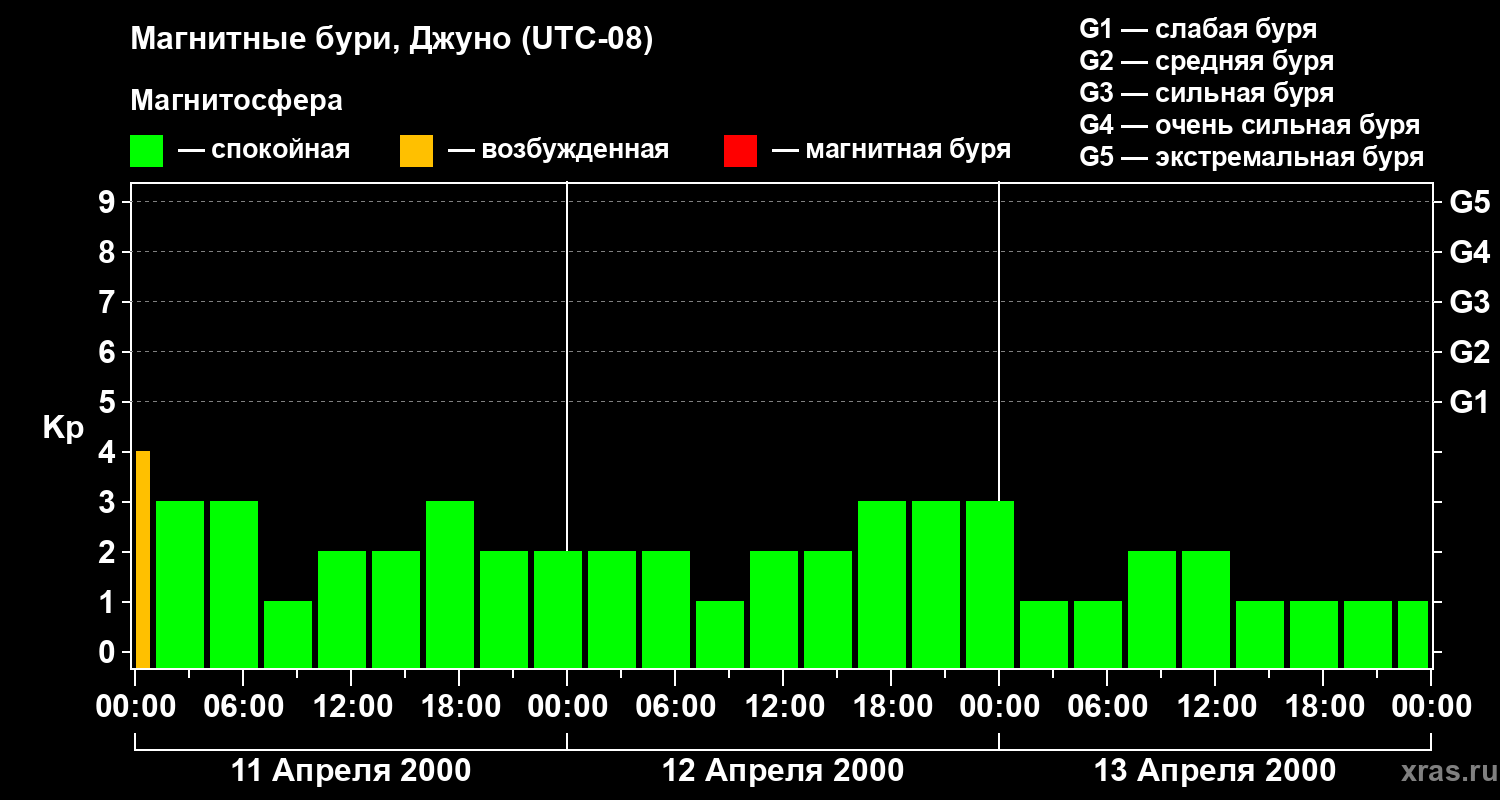 Изменения геомагнитного индекса Kp с 11 по 13 апреля 2000 года для средних широт