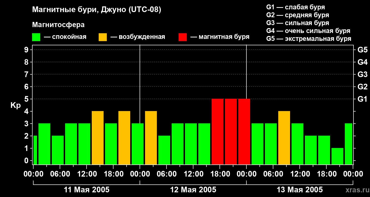 Изменения геомагнитного индекса Kp с 11 по 13 мая 2005 года для средних широт