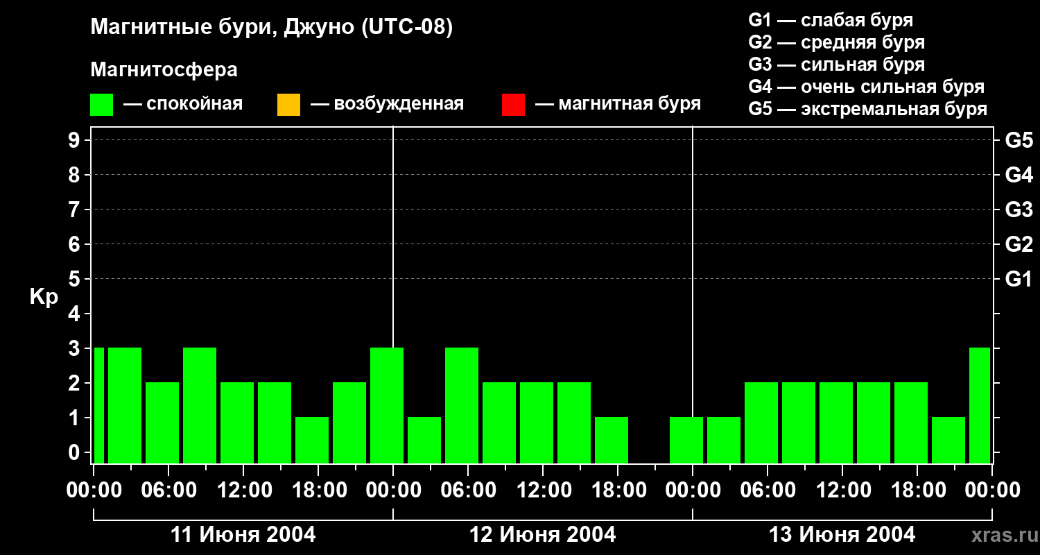 Изменения геомагнитного индекса Kp с 11 по 13 июня 2004 года для средних широт