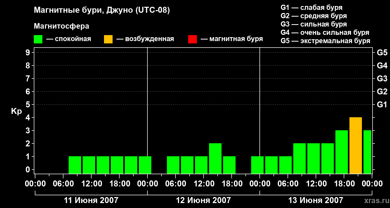 Изменения геомагнитного индекса Kp с 11 по 13 июня 2007 года для средних широт