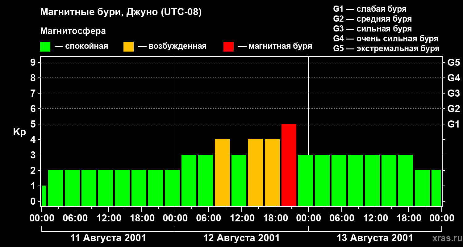 Изменения геомагнитного индекса Kp с 11 по 13 августа 2001 года для средних широт
