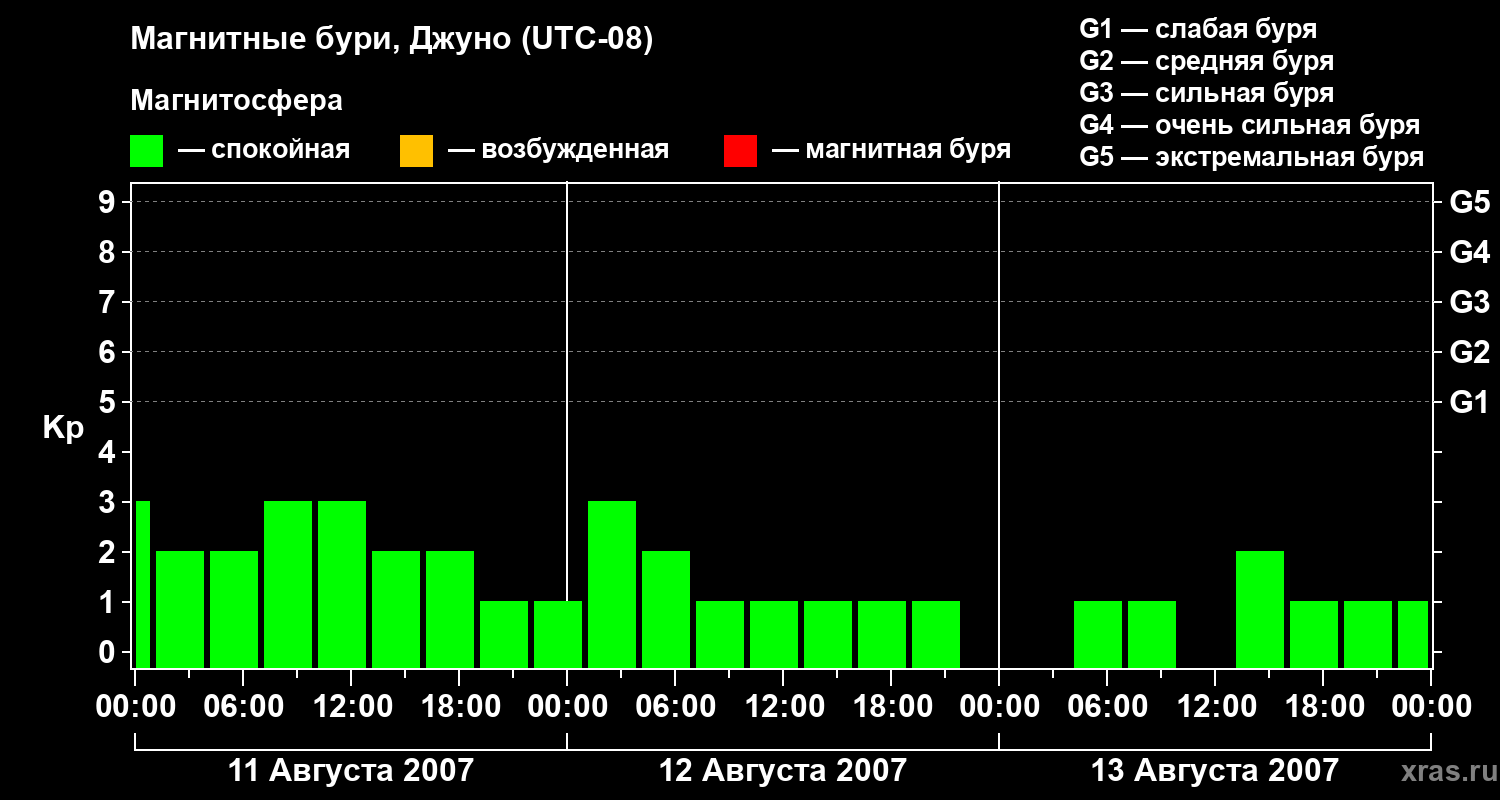 Изменения геомагнитного индекса Kp с 11 по 13 августа 2007 года для средних широт