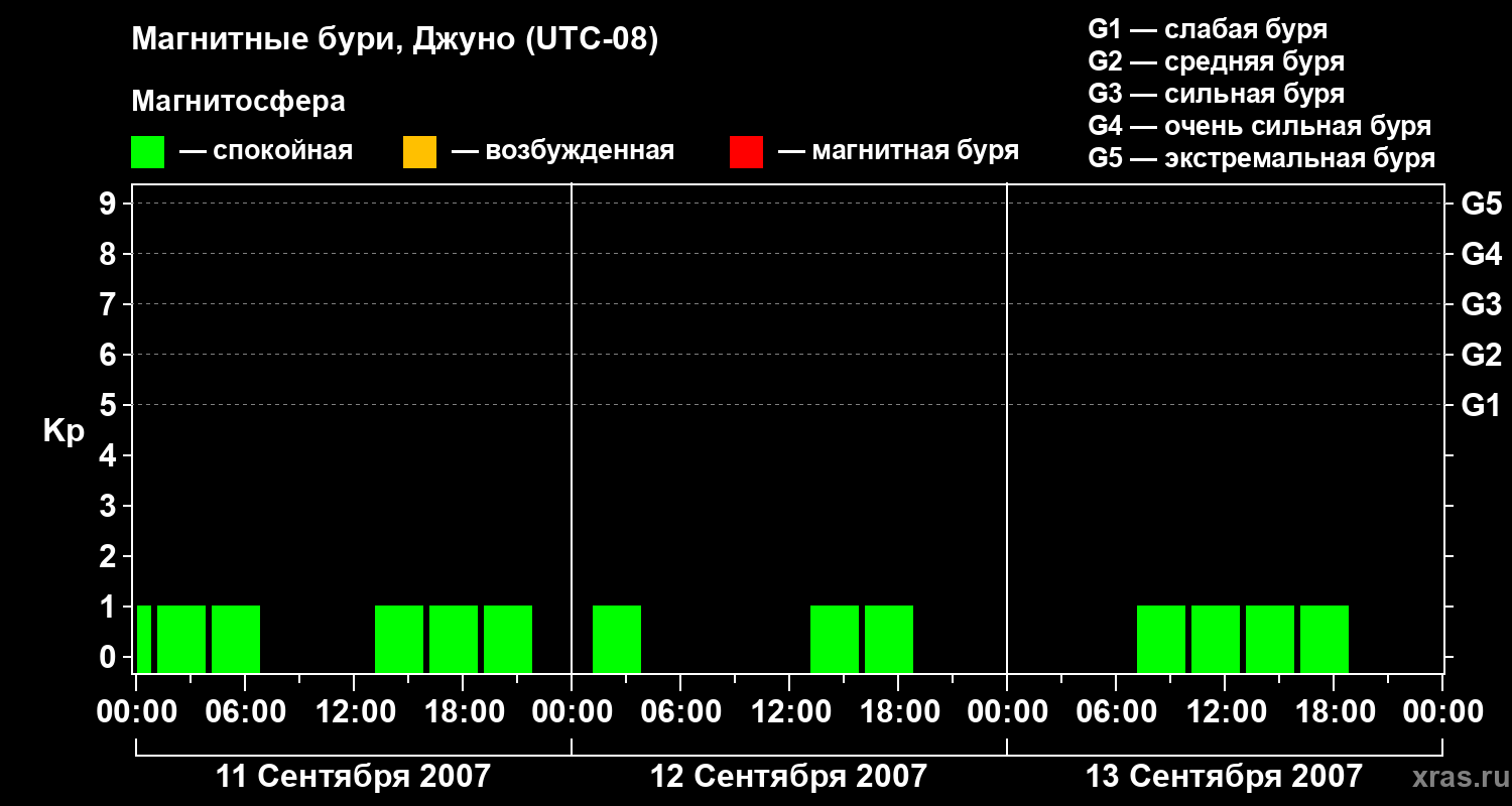 Изменения геомагнитного индекса Kp с 11 по 13 сентября 2007 года для средних широт