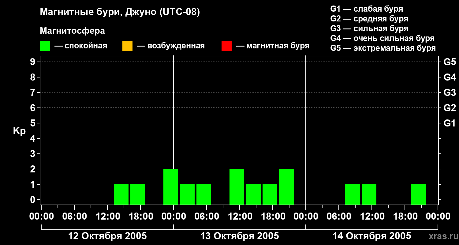 Изменения геомагнитного индекса Kp с 12 по 14 октября 2005 года для средних широт