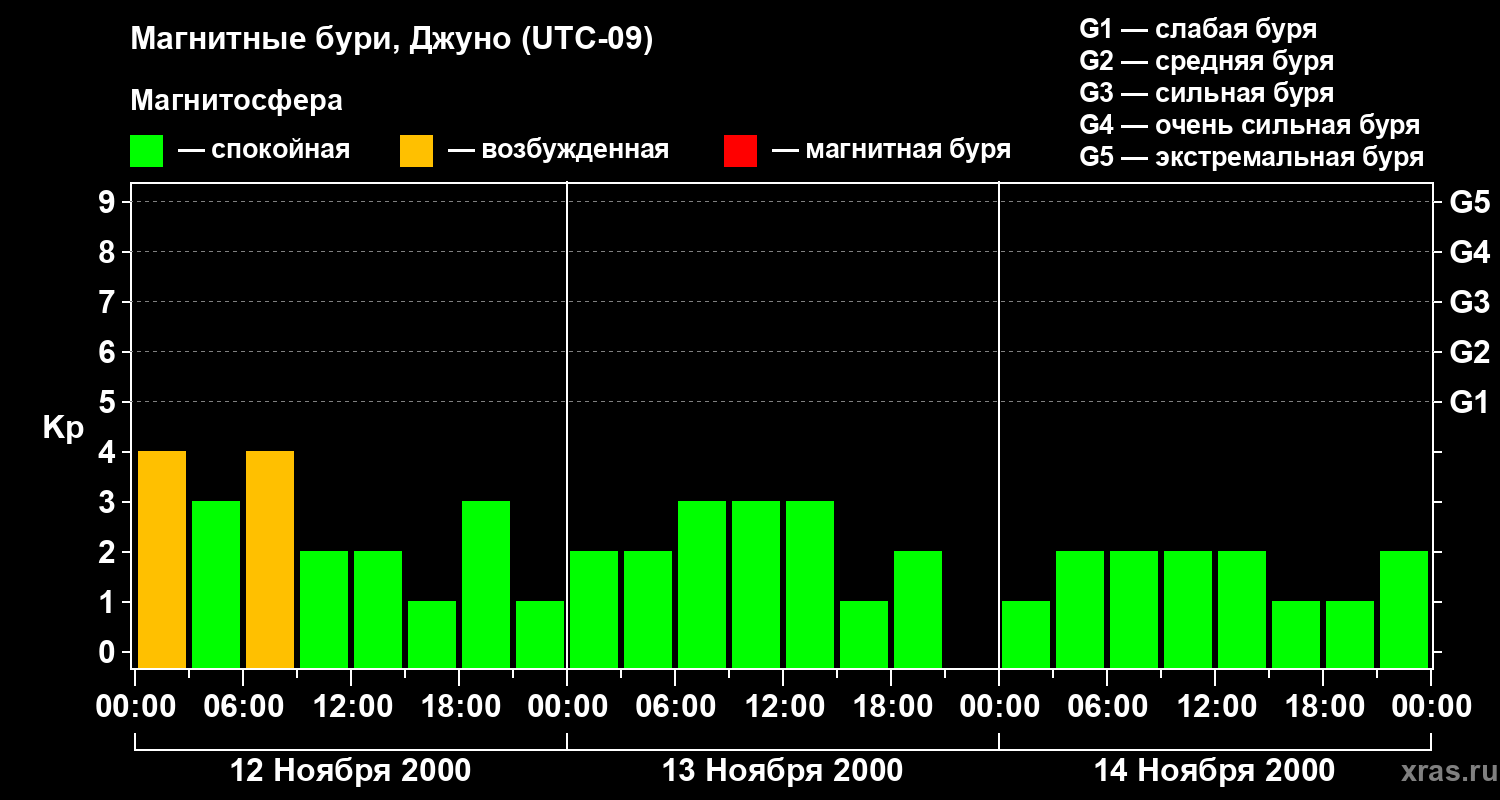 Изменения геомагнитного индекса Kp с 12 по 14 ноября 2000 года для средних широт