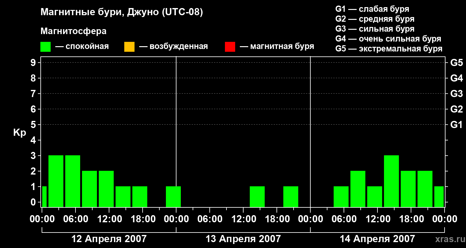 Изменения геомагнитного индекса Kp с 12 по 14 апреля 2007 года для средних широт