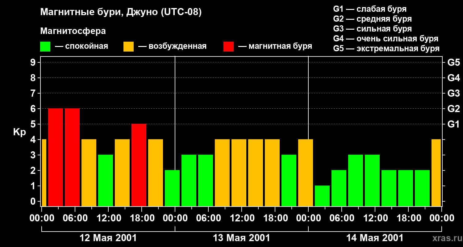 Изменения геомагнитного индекса Kp с 12 по 14 мая 2001 года для средних широт