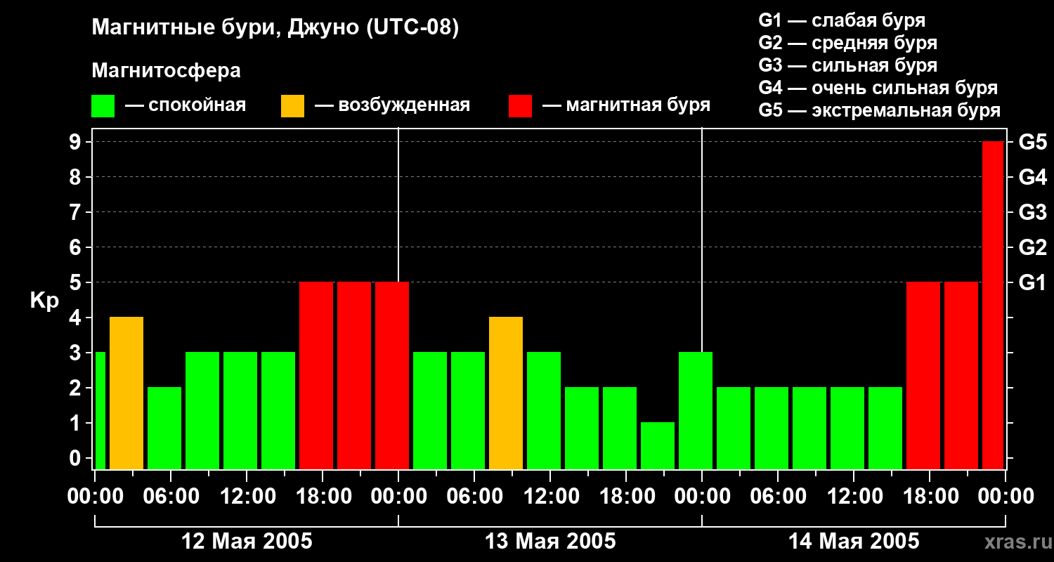 Изменения геомагнитного индекса Kp с 12 по 14 мая 2005 года для средних широт