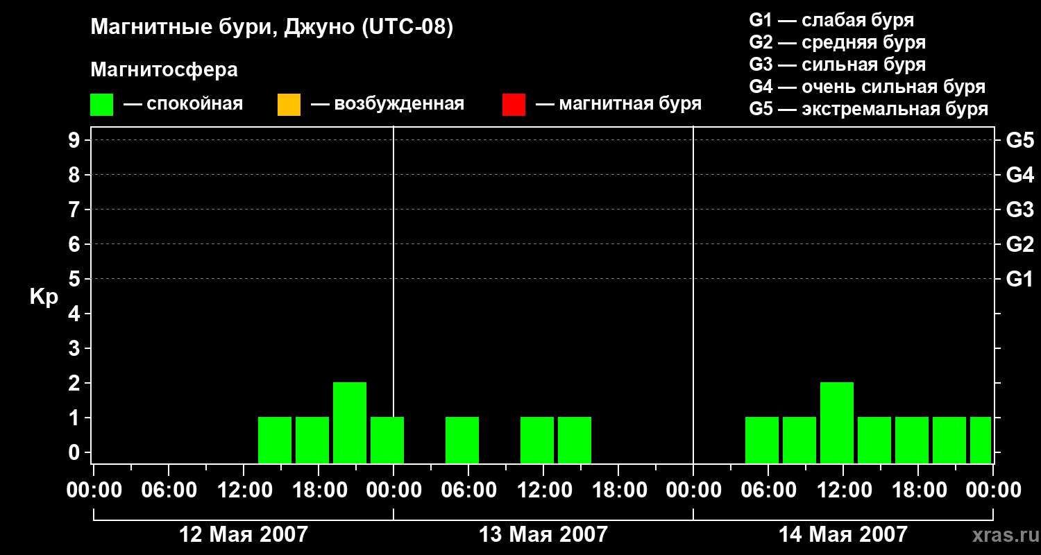Изменения геомагнитного индекса Kp с 12 по 14 мая 2007 года для средних широт