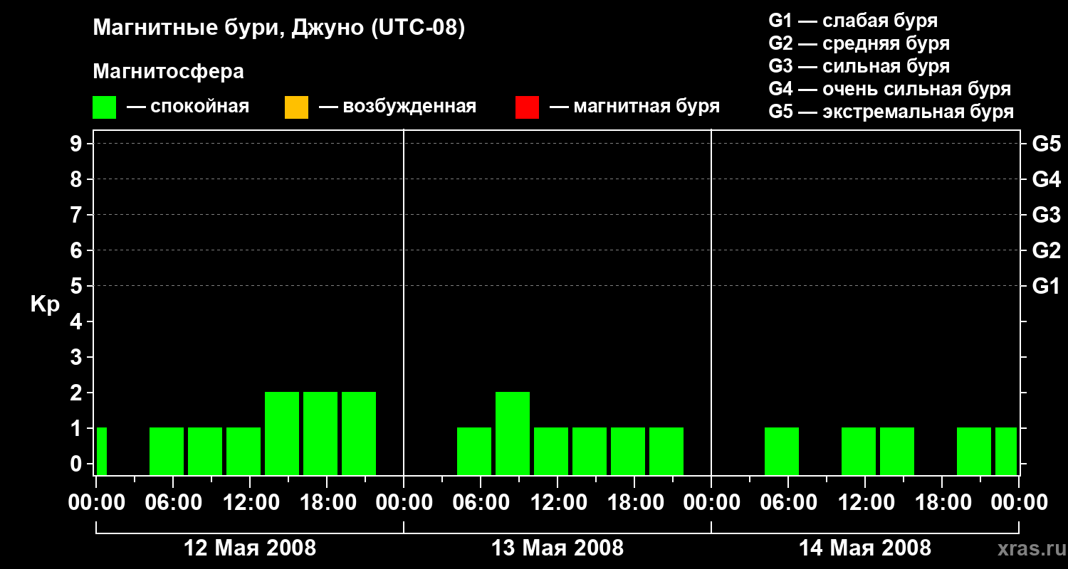 Изменения геомагнитного индекса Kp с 12 по 14 мая 2008 года для средних широт