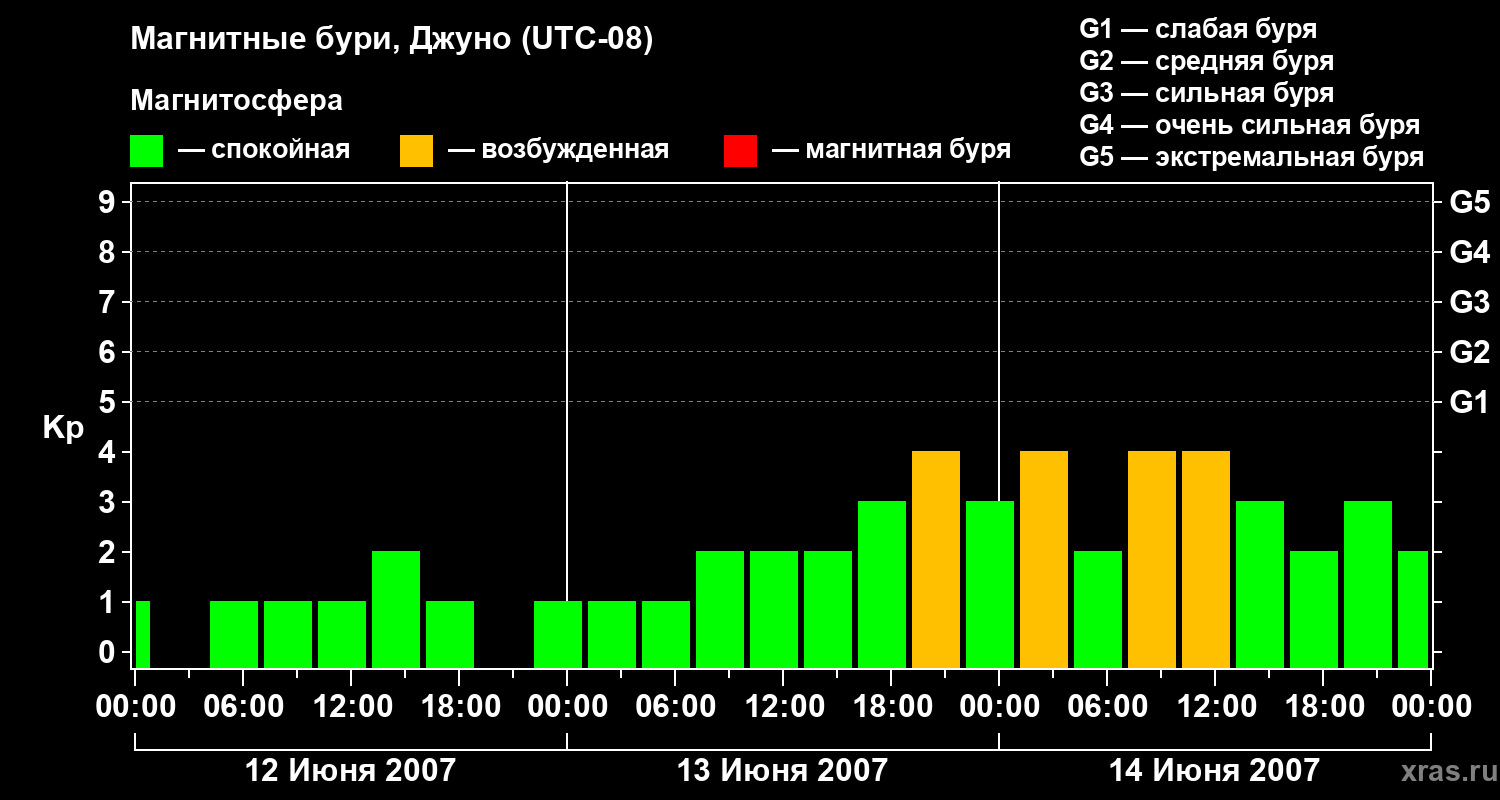 Изменения геомагнитного индекса Kp с 12 по 14 июня 2007 года для средних широт