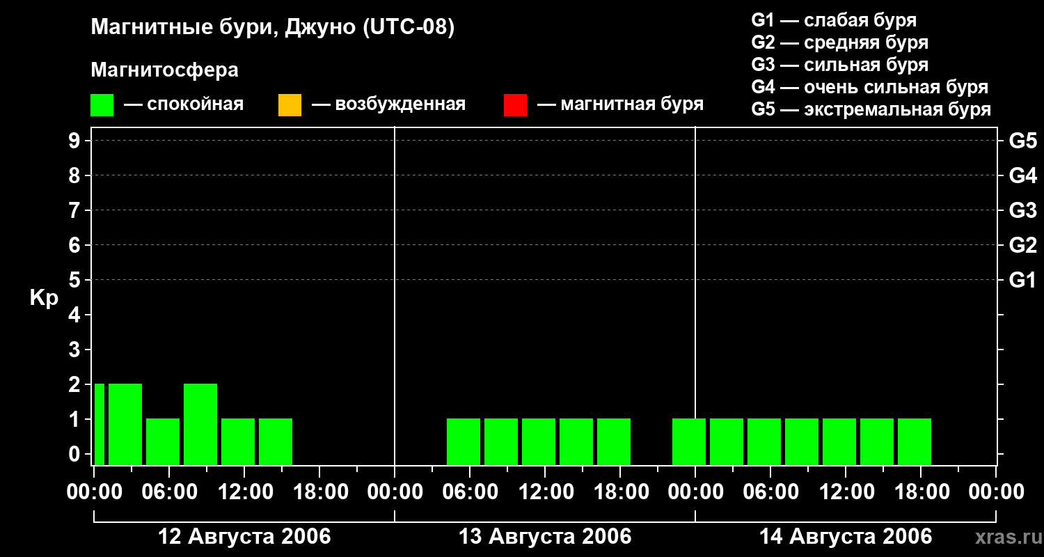 Изменения геомагнитного индекса Kp с 12 по 14 августа 2006 года для средних широт