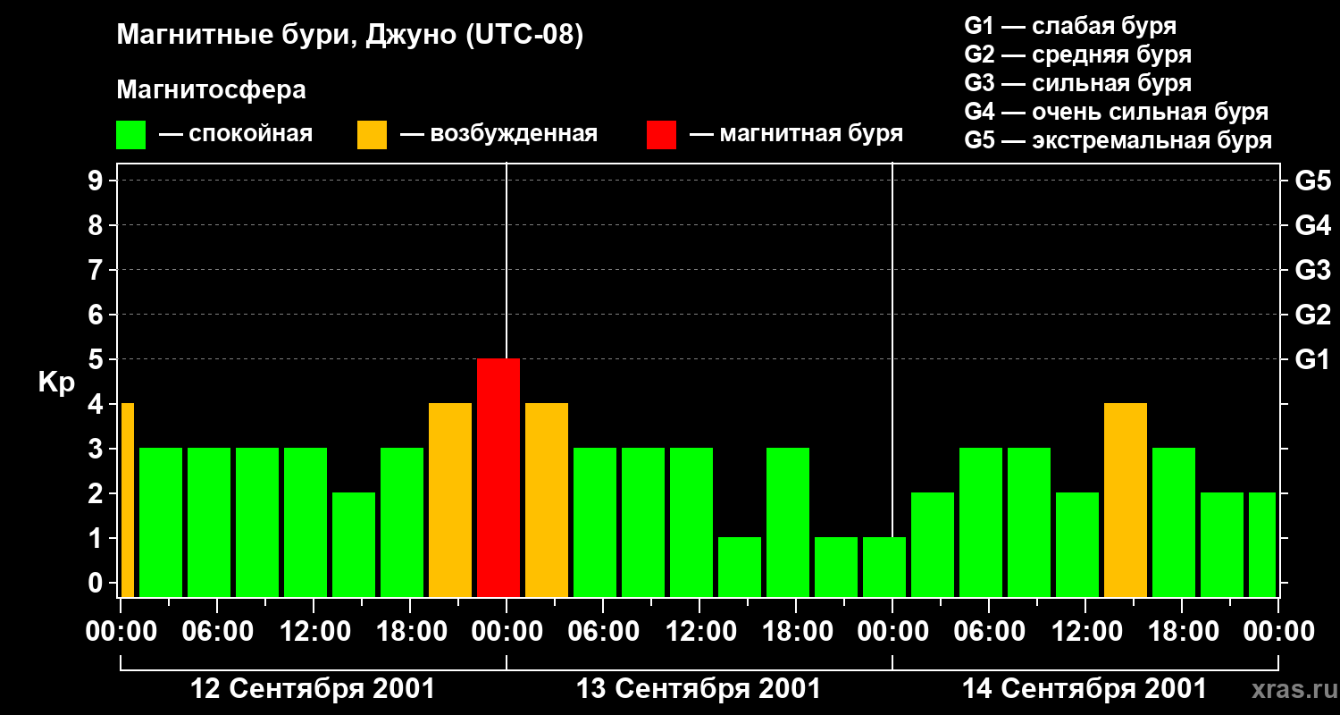Изменения геомагнитного индекса Kp с 12 по 14 сентября 2001 года для средних широт