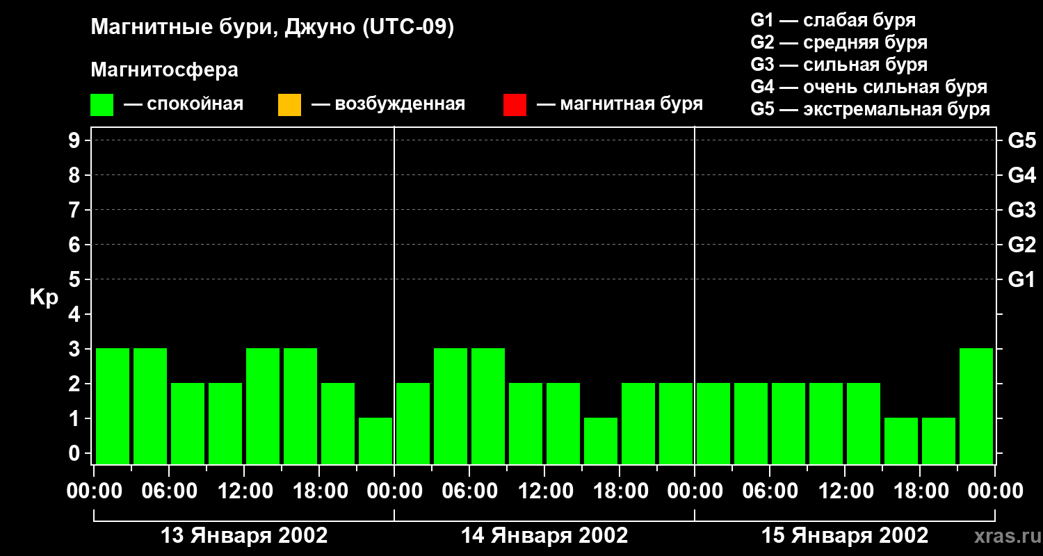 Изменения геомагнитного индекса Kp с 13 по 15 января 2002 года для средних широт