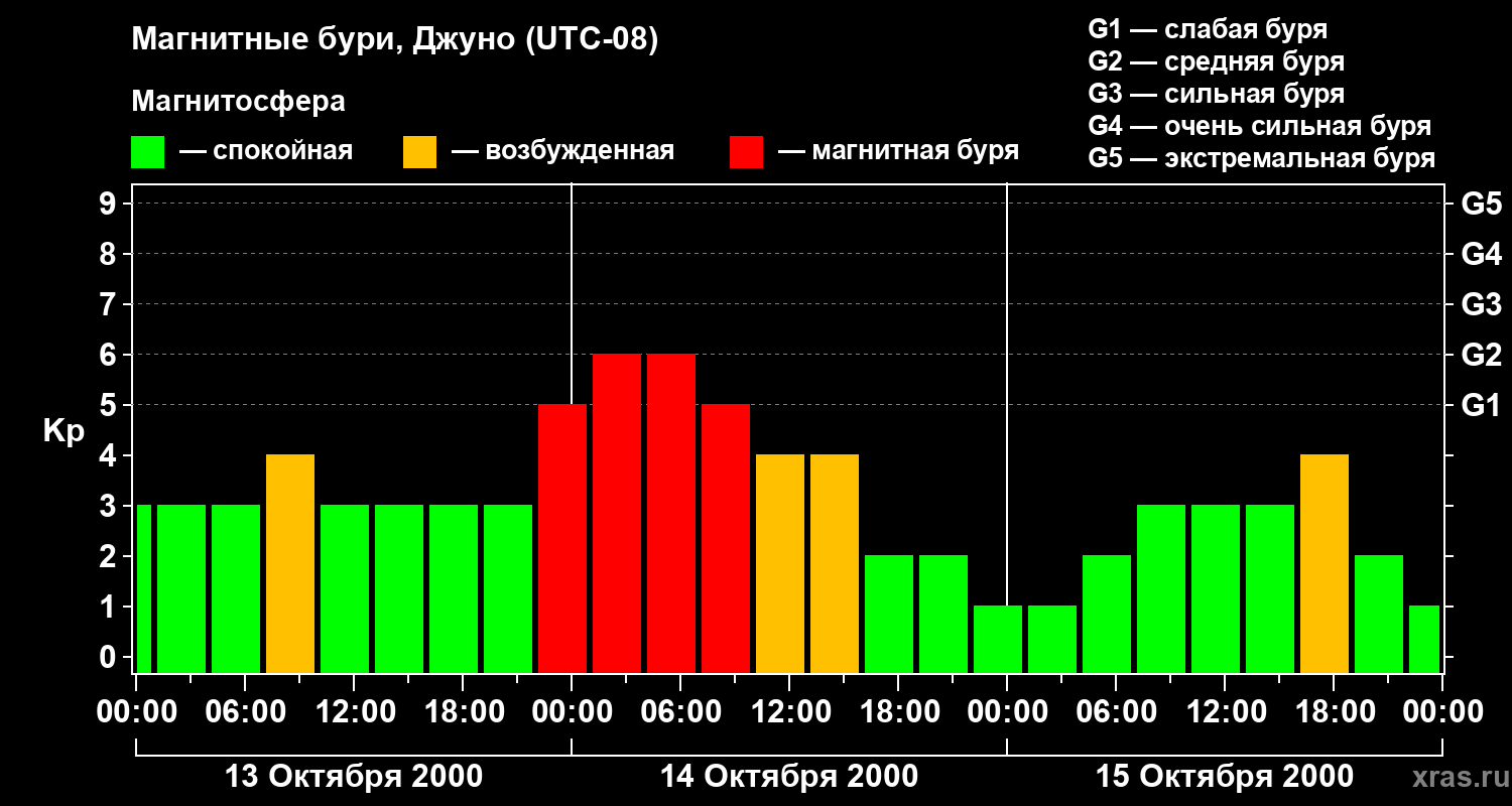 Изменения геомагнитного индекса Kp с 13 по 15 октября 2000 года для средних широт