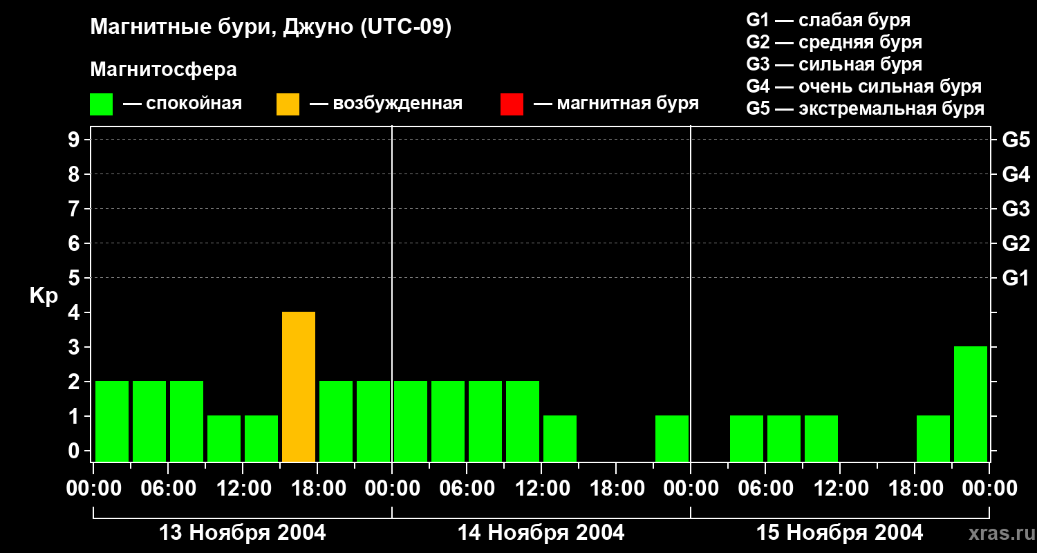 Изменения геомагнитного индекса Kp с 13 по 15 ноября 2004 года для средних широт